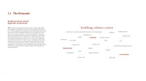 The meaning of a building culture centre could be defined by the students themselves . The Start of this building culture centre in Eschen began firstly by analysing the title itself . Examining every word of the title separately gives a first insight on such a centre . For instant , the word „ culture “ has different meanings and can be associated with community , education , cultivating and agriculture , take care and more . The same was done with the words „ building “ and „ centre “. The result was an ensemble of different words with the same origin . This approach was very supportive for having a first definition of building culture centre , which consist of the tree words “ community , creating and intersection ”. Furthermore , the collected synonyms of the words „ building , culture and centre “ have influenced the design process throughout . building culture centre