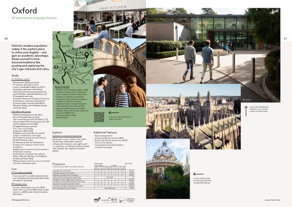 - EF Intensive : 32 lessons / week - EF General : 26 lessons / week - Exams : Cambridge English and IELTS - Internship experience with Oxfam , Oxford University Science Department , Jack FM Radio , Studio8 Marketing and Photography and more - University Placement Programs & Services - SPIN lessons , including Sustainability & Social Impact , International Affairs , Effective Writing , Film & Media Studies and Exam Skills