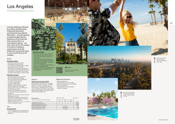 - EF Intensive : 32 lessons / week - EF General : 26 lessons / week - Exams Skills : Cambridge English , TOEFL - University Placement Services - SPIN lessons , including Sustainability & Social Impact , Social Media & Influencers , Introduction to Hollywood , film studies , journalism , photography , creative writing