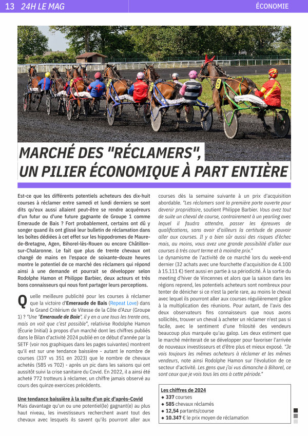 Q uelle meilleure publicité pour les courses à réclamer que la victoire d ' Emeraude de Bais( Repeat Love) dans le Grand Critérium de Vitesse de la Côte d ' Azur( Groupe 1)? " Une " Emeraude de Baie ", il y en a une tous les trente ans, mais on voit que c ' est possible ", relativise Rodolphe Hamon( Écurie Initial) à propos d ' un marché dont les chiffres publiés dans le Bilan d ' activité 2024 publié en ce début d ' année par la SETF( voir nos graphiques dans les pages suivantes) montrent qu ' il est sur une tendance baissière- autant le nombre de courses( 337 vs 351 en 2023) que le nombre de chevaux achetés( 585 vs 702)- après un pic dans les saisons qui ont aussitôt suivi la crise sanitaire du Covid. En 2022, il a ainsi été acheté 772 trotteurs à réclamer, un chiffre jamais observé au cours des quinze exercices précédents.