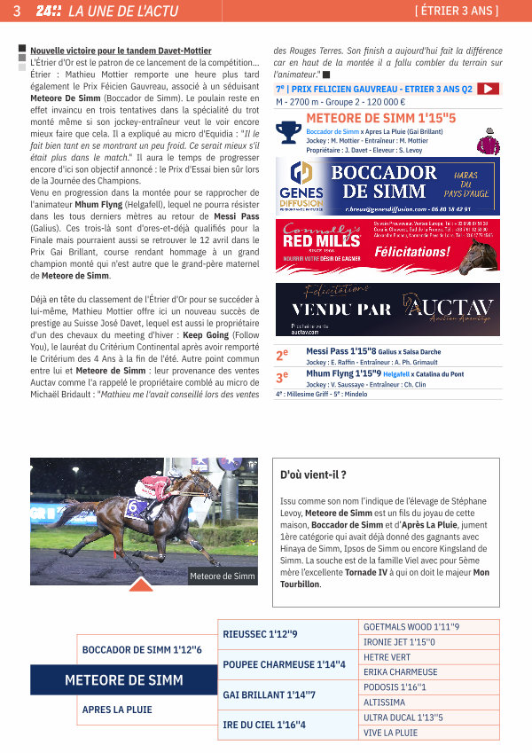 Nouvelle victoire pour le tandem Davet-Mottier L ' Étrier d ' Or est le patron de ce lancement de la compétition... Étrier: Mathieu Mottier remporte une heure plus tard également le Prix Féicien Gauvreau, associé à un séduisant Meteore De Simm( Boccador de Simm). Le poulain reste en effet invaincu en trois tentatives dans la spécialité du trot monté même si son jockey-entraîneur veut le voir encore mieux faire que cela. Il a expliqué au micro d ' Equidia: " Il le fait bien tant en se montrant un peu froid. Ce serait mieux s ' il était plus dans le match." Il aura le temps de progresser encore d ' ici son objectif annoncé: le Prix d ' Essai bien sûr lors de la Journée des Champions. Venu en progression dans la montée pour se rapprocher de l ' animateur Mhum Flyng( Helgafell), lequel ne pourra résister dans les tous derniers mètres au retour de Messi Pass( Galius). Ces trois-là sont d ' ores-et-déjà qualifiés pour la Finale mais pourraient aussi se retrouver le 12 avril dans le Prix Gai Brillant, course rendant hommage à un grand champion monté qui n ' est autre que le grand-père maternel de Meteore de Simm. des Rouges Terres. Son finish a aujourd ' hui fait la différence car en haut de la montée il a fallu combler du terrain sur l ' animateur." � e