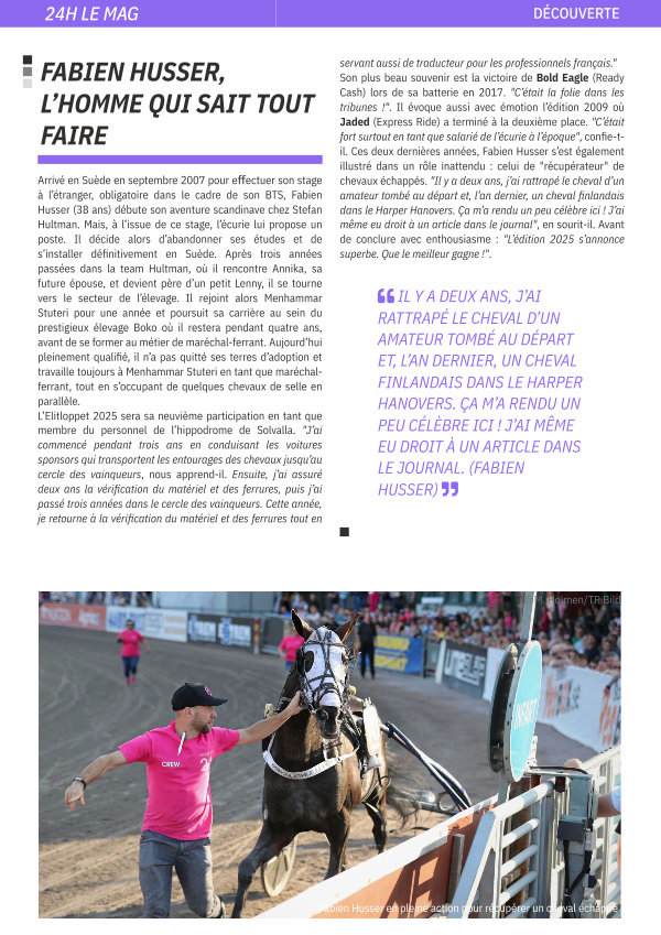 Arrivé en Suède en septembre 2007 pour effectuer son stage à l’étranger, obligatoire dans le cadre de son BTS, Fabien Husser (38 ans) débute son aventure scandinave chez Stefan Hultman. Mais, à l’issue de ce stage, l’écurie lui propose un poste. Il décide alors d’abandonner ses études et de s’installer définitivement en Suède. Après trois années passées dans la team Hultman, où il rencontre Annika, sa future épouse, et devient père d’un petit Lenny, il se tourne vers le secteur de l’élevage. Il rejoint alors Menhammar Stuteri pour une année et poursuit sa carrière au sein du prestigieux élevage Boko où il restera pendant quatre ans, avant de se former au métier de maréchal-ferrant. Aujourd’hui pleinement qualifié, il n’a pas quitté ses terres d’adoption et travaille toujours à Menhammar Stuteri en tant que maréchalferrant , tout en s’occupant de quelques chevaux de selle en parallèle. L’Elitloppet 2025 sera sa neuvième participation en tant que membre du personnel de l’hippodrome de Solvalla. "J’ai commencé pendant trois ans en conduisant les voitures sponsors qui transportent les entourages des chevaux jusqu’au cercle des vainqueurs , nous apprend-il. Ensuite, j’ai assuré deux ans la vérification du matériel et des ferrures, puis j’ai passé trois années dans le cercle des vainqueurs. Cette année, je retourne à la vérification du matériel et des ferrures tout en servant aussi de traducteur pour les professionnels français." Son plus beau souvenir est la victoire de Bold Eagle (Ready Cash) lors de sa batterie en 2017. "C’était la folie dans les tribunes !". Il évoque aussi avec émotion l’édition 2009 où Jaded (Express Ride) a terminé à la deuxième place. "C’était fort surtout en tant que salarié de l’écurie à l’époque", confie-til . Ces deux dernières années, Fabien Husser s’est également illustré dans un rôle inattendu : celui de "récupérateur " de chevaux échappés. "Il y a deux ans, j’ai rattrapé le cheval d’un amateur tombé au départ et, l’an dernier, un cheval finlandais dans le Harper Hanovers. Ça m’a rendu un peu célèbre ici ! J’ai même eu droit à un article dans le journal", en sourit-il. Avant de conclure avec enthousiasme : "L’édition 2025 s’annonce superbe. Que le meilleur gagne !".