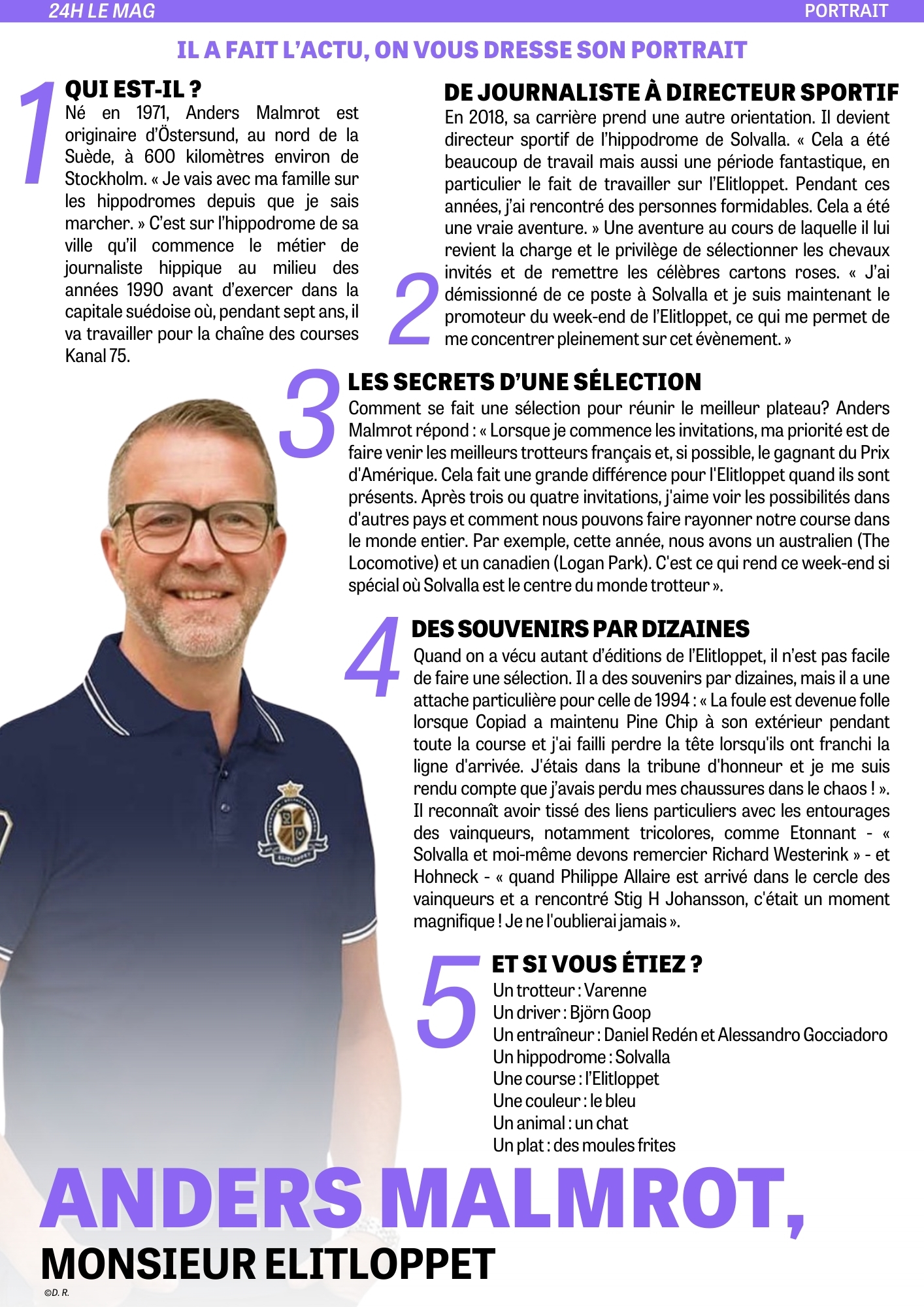 2- De journaliste à directeur sportif En 2018, sa carrière prend une autre orientation. Il devient directeur sportif de l’hippodrome de Solvalla. "Cela a été beaucoup de travail mais aussi une période fantastique, en particulier le fait de travailler sur l’Elitloppet. Pendant ces années, j’ai rencontré des personnes formidables. Cela a été une vraie aventure." Une aventure au cours de laquelle il lui revient la charge et le privilège de sélectionner les chevaux invités et de remettre les célèbres cartons roses. "J’ai démissionné de ce poste à Solvalla et je suis maintenant le promoteur du week-end de l’Elitloppet, ce qui me permet de me concentrer pleinement sur cet évènement."