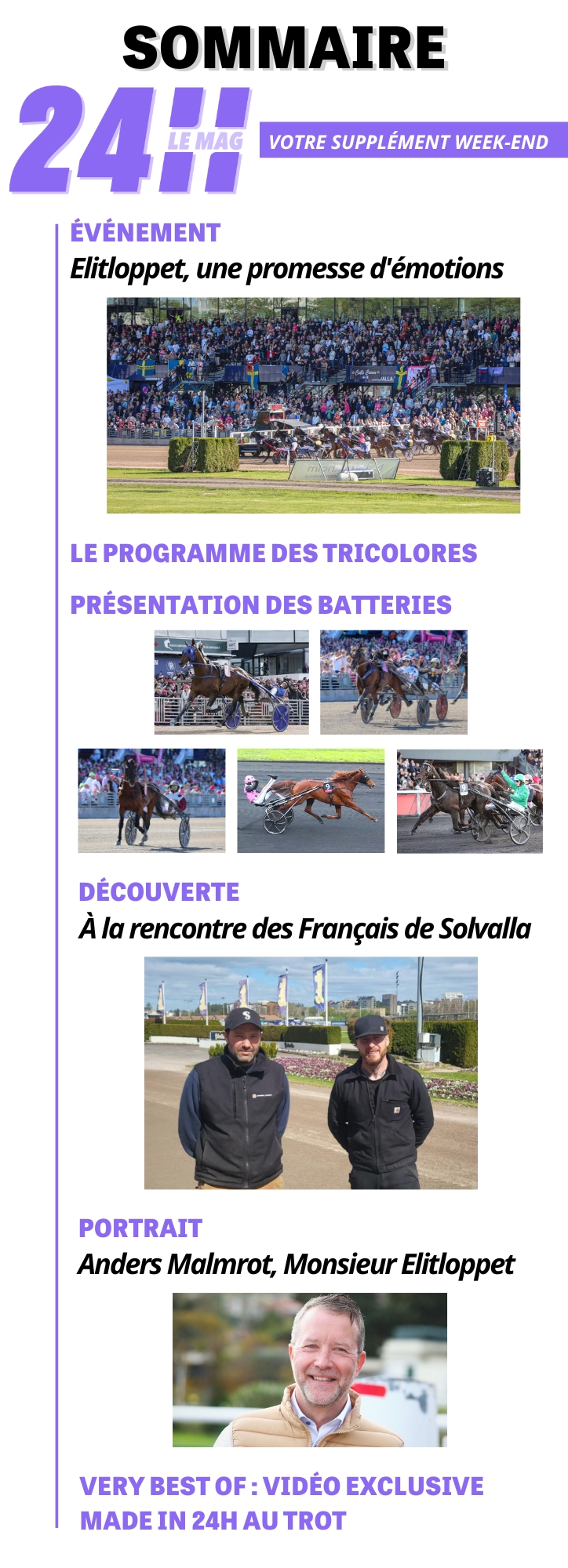 'est un grand habitué des lieux. Richard Westerink sera ce week-end à Solvalla comme chez lui. Et pour cause, il y sera reçu avec les honneurs d'ancien vainqueur de la course. Un titre plus qu'honorifique pour le plus Français des Hollandais et vice-versa : il a en effet à son palmarès pas moins de trois succès dans la plus grande des courses scandinaves, soit autant que la référence Léopold Verroken, un de moins que Johammes Frömming et la moitié de la légende des légendes Stig Johansson. Mais il a en revanche un record unique dans l'histoire d'une course qui fêtera ce week-end sa 74ème édition : il est le seul à avoir gagné l'Elitloppet avec un fils d'un précédent vainqueur. En s'imposant en 2022, Étonnant rejoignait ainsi au palmarès son illustre père Timoko , lauréat des éditions 2014 et 2017. Ce doublé fut déjà retentissant. Si la première victoire fut la concrétisation d'une magnifique séquence débutée douze mois plus tôt par une 3ème place dans l'édition 2013, Timoko apportait à son génial entraîneur son premier sacre majeur. D'aucuns pensaient que le cadeau était déjà bien beau et qu'il serait difficile de réitérer pareil exploit. C'était alors déjà mal connaître Richard le Conquérant. Trois ans plus tard, alors âgé de 10ans, l'inoubliable Timoko allait devenir le plus " vieux" vainqueur d'Elitloppet, avec la complicité de Björn Goop. Il était alors clair et définitif qu'impossible n'est pas Westerink. Les bonnes fées hippiques s'étaient déjà bien assez penchées sur le berceau du solide Richard ? Que nenni ! À force de travail, de détermination et de talent, l'entraîneur des Landes allait donc faire dans l'inédit en propulsant Étonnant ( Timoko) au sommet lors de l'édition 2022, s'imposant malgré une faute à 800m du but, ce que jamais personne n'avait encore fait non plus. Sa ligne droite finale fut magique. Mais pas question de s'arrêter là. Jamais. Auteur d'un comeback ahurissant, auquel même ses plus inconditionnels fans ne croyaient pas, Étonnant a reçu une invitation pour participer à un nouvel Elitlopp, son 3ème à titre personnel. Sa mission ? Devenir le premier trotteur à l'emporter à 11ans, le deuxième à réaliser le doublé à trois ans d'intervalle et entretenir le mythe de Timoko . Et si cela peut paraitre impossible, c'est justement une raison supplémentaire d' y croire ! Toute l'équipe de 24h le Mag a le plaisir de vous proposer ce numéro spécial afin de vivre au mieux, comme si vous y étiez , le grand week-end de l'Elitloppet 2025, au cours duquel on suivra de près nos représentants tricolores (ils débarquent en force pour tenter de poursuivre la superbe série) et tous les exploits des champions trotteurs.