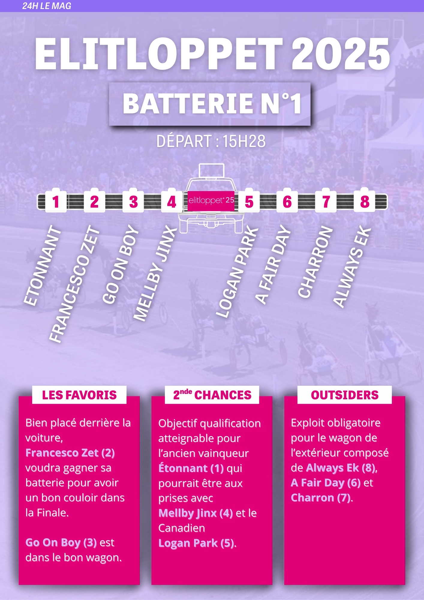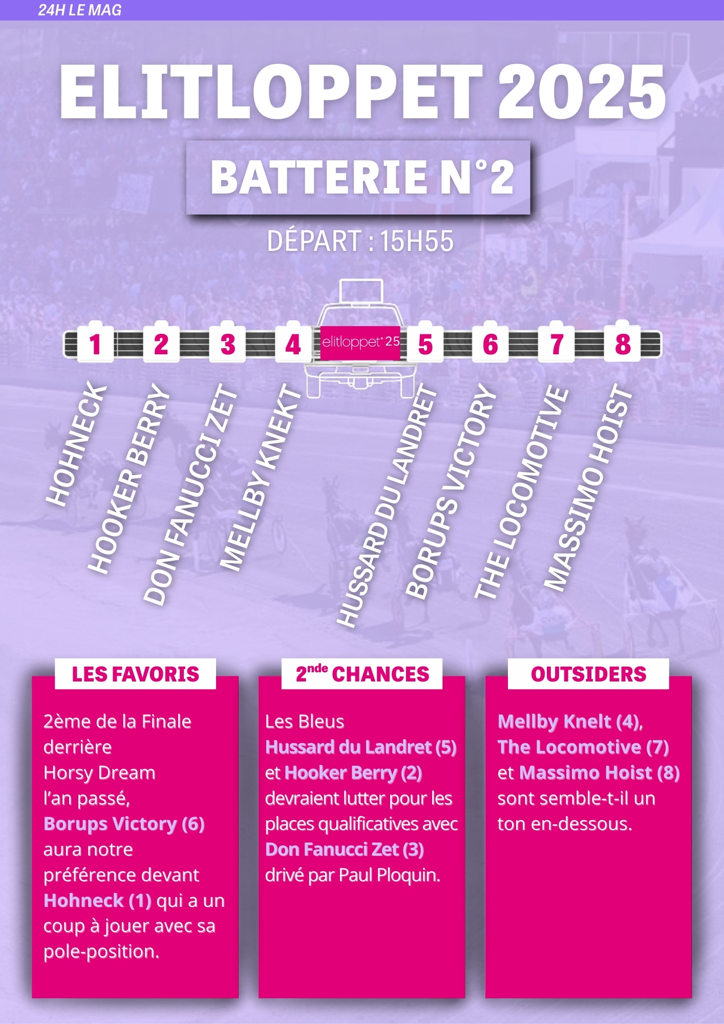 Un an plus tard, si Horsy Dream sera le grand absent, Etonnant et Hohneck reviennent eux à la tête d'une coalition tricolore forte de cinq représentants comme l'an dernier à savoir Go On Boy (Password), avec lequel Romain Derieux peut remporter un second Elitloppet six ans après celui de Dijon (Ganymède) et les nouveaux-venus que sont Hooker Berry ( Booster Winner ) et Hussard du Landret ( Bird Parker ). Le tirage au sort des places derrière l'autostart dans les deux batteries a souri à la team France. De quoi alimenter les ambitions du clan français pour tenter de faire résonner une nouvelle fois la Marseillaise un dimanche de mai à Solvalla.