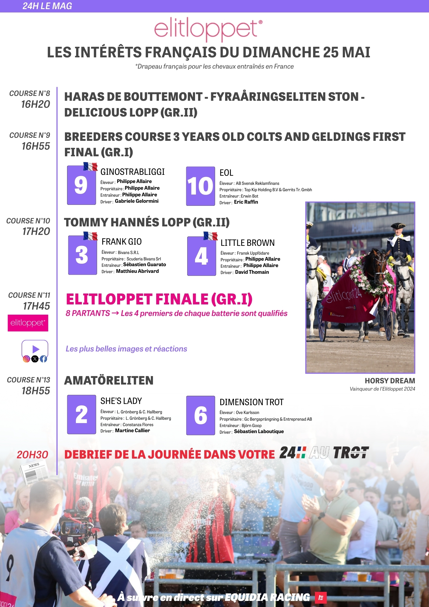 Pour suivre l'intégralité de ce week-end suédois, ce numéro spécial de 24h le Mag se décline en un guide afin de ne rien rater des événements qui vont se succéder, à travers le programme des Tricolores, aussi bien samedi avec notamment le Harper Hanovers que dimanche et ses multiples rendez-vous, la présentation des concurrents des deux batteries de l'Elitloppet, une rencontre avec trois