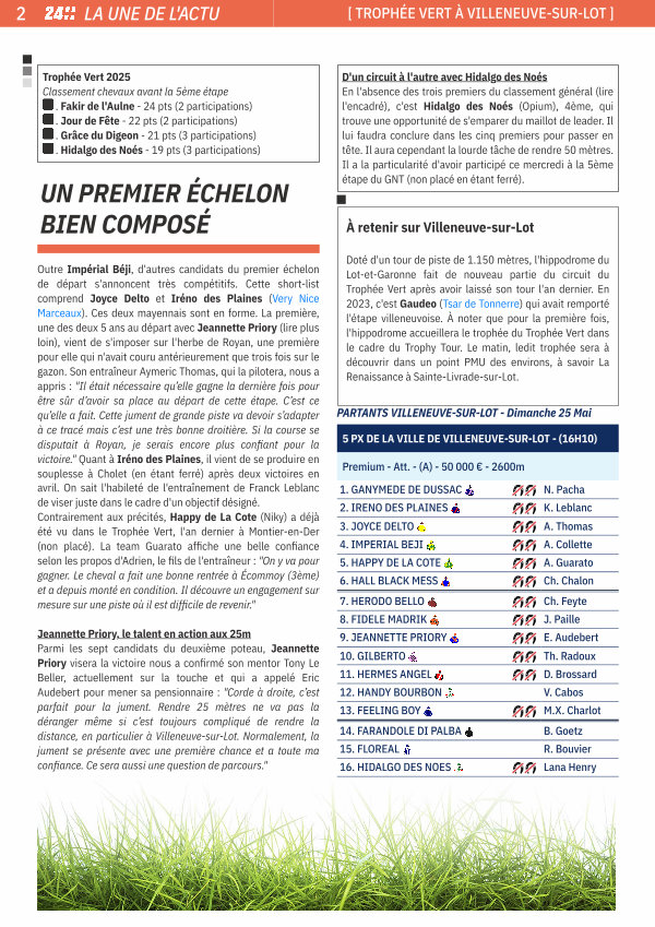 Doté d ' un tour de piste de 1.150 mètres, l ' hippodrome du Lot-et-Garonne fait de nouveau partie du circuit du Trophée Vert après avoir laissé son tour l ' an dernier. En 2023, c ' est Gaudeo( Tsar de Tonnerre) qui avait remporté l ' étape villeneuvoise. À noter que pour la première fois, l ' hippodrome accueillera le trophée du Trophée Vert dans le cadre du Trophy Tour. Le matin, ledit trophée sera à découvrir dans un point PMU des environs, à savoir La Renaissance à Sainte-Livrade-sur-Lot.