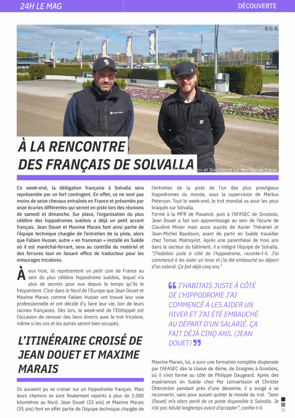 l’ entretien de la piste de l’ un des plus prestigieux hippodromes du monde, sous la supervision de Markus Peterson. Tout le week-end, le trot mondial va avoir les yeux braqués sur Solvalla. Formé à la MFR de Pouancé, puis à l’ AFASEC de Grosbois, Jean Douet a fait son apprentissage au sein de l’ écurie de Claudine Minier mais aussi auprès de Xavier Thévenet et Jean-Michel Baudouin, avant de partir en Suède travailler chez Tomas Malmqvist. Après une parenthèse de trois ans dans le secteur du bâtiment, il a intégré l’ équipe de Solvalla. " J’ habitais juste à côté de l ' hippodrome, raconte-t-il. J’ ai commencé à les aider un hiver et j’ ai été embauché au départ d’ un salarié. Ça fait déjà cinq ans."