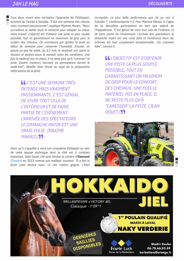 � C’ EST UNE SEMAINE TRÈS INTENSE MAIS VRAIMENT PASSIONNANTE. C’ EST GÉNIAL DE VIVRE TOUT CELA DE L’ INTÉRIEUR ET DE FAIRE PARTIE DE L’ ÉVÉNEMENT. L’ ARRIVÉE DES SPECTATEURS LE DIMANCHE MATIN EST UNE VRAIE FOLIE.( MAXIME MARAIS) � incroyable. La plus belle performance que j’ ai pu voir à Solvalla!", s’ enthousiasme-t-il. Pour Maxime Marais, il s’ agira de sa deuxième participation en tant que salarié de l’ hippodrome. " C’ est génial de vivre tout cela de l’ intérieur et de faire partie de l’ événement. L’ arrivée des spectateurs le dimanche matin est une vraie folie et l’ ambiance dans les tribunes est tout simplement exceptionnelle. J’ ai vraiment hâte ", conclut-il.