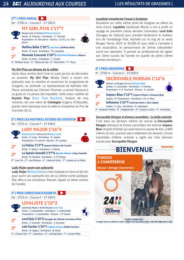 Loyaliste transforme l ' essai à Graignes Deuxième sur cette même piste de Graignes au début du mois d ' avril, Loyaliste( Goetmals Wood) a mis à profit un voyage en première classe derrière l ' animateur Lord Eole( Ouragan de Celland) pour prendre facilement le meilleur lors de l ' emballage final. Racheté sur le ring de la vente Rouges Terres 2024( à 30.000 €) puis cédé à l ' amiable à une association, le pensionnaire de James Lebouteiller ouvre son palmarès. Il permet au professionnel de signer son 2ème succès de l ' année en qualité de pilote( 3ème comme entraîneur).