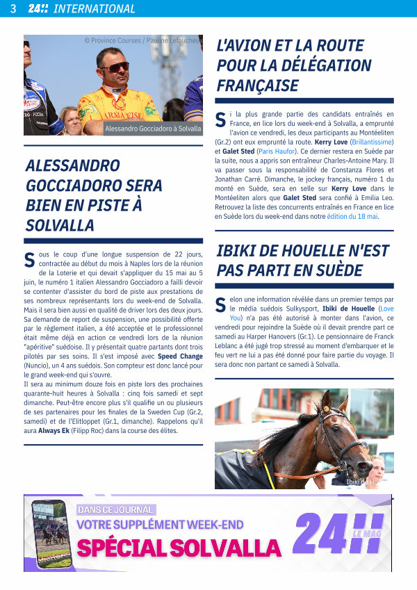 S i la plus grande partie des candidats entraînés en France, en lice lors du week-end à Solvalla, a emprunté l ' avion ce vendredi, les deux participants au Montéeliten( Gr. 2) ont eux emprunté la route. Kerry Love( Brillantissime) et Galet Sted( Paris Haufor). Ce dernier restera en Suède par la suite, nous a appris son entraîneur Charles-Antoine Mary. Il va passer sous la responsabilité de Constanza Flores et Jonathan Carré. Dimanche, le jockey français, numéro 1 du monté en Suède, sera en selle sur Kerry Love dans le Montéeliten alors que Galet Sted sera confié à Emilia Leo. Retrouvez la liste des concurrents entraînés en France en lice en Suède lors du week-end dans notre édition du 18 mai.