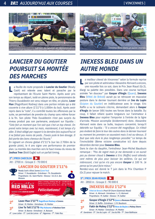 L a feuille de route proposée à Lancier du Goutier( Ready Cash) est relevée avec talent et panache par le représentant de l ' Ecurie Saint Martin. Après avoir pris son temps au départ, isolé en pleine piste, le pensionnaire de Thierry Duvaldestin est venu relayer en tête, en plaine, Lover Man( Magni cent Rodney) dans une portion initiale qui a été couverte à vive allure( 1 ' 11 '' 0 à 1.000m du but). Après avoir repris dans la " cote ", il a contrôlé toutes les offensives par la suite, se permettant de prendre du champ sans même forcer à la n. Son pilote Théo Duvaldestin n ' est pas surpris du niveau produit pas son partenaire, analysant sur Equidia: " Cela fait un moment que l ' on sait que c ' est un top cheval. On prend notre temps avec lui mais, maintenant, il est temps d ' y aller. Il était allégé par rapport à la dernière fois aujourd ' hui et il ne fallait pas moins de poids. J ' avais juste le bon dosage. Il fait partie des bons chevaux de l ' écurie." En signant un chrono global d ' 1 ' 11 '' 6( sur les 2.700m de la grande piste), le 4 ans signe une performance de premier plan. La montée des marches vers le haut niveau du neveu de Jushua Tree( Bold Eagle) suit un parfait timing.