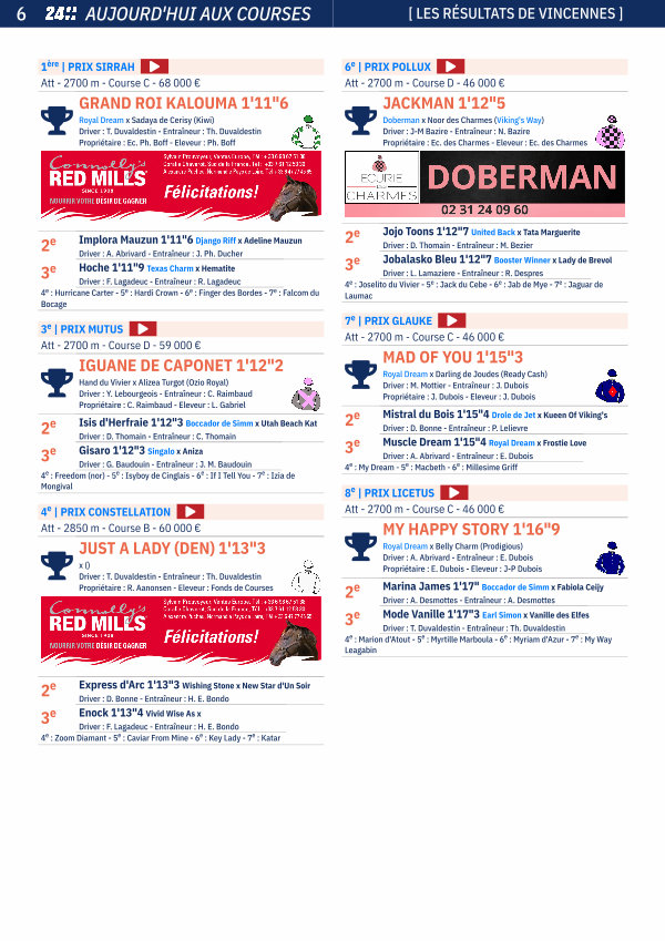 Royal Dream x Belly Charm( Prodigious) Driver: A. Abrivard- Entraîneur: E. Dubois Propriétaire: E. Dubois- Eleveur: J-P Dubois