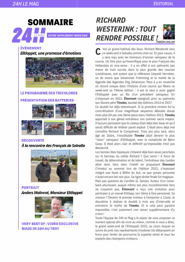 ' est un grand habitué des lieux. Richard Westerink sera ce week-end à Solvalla comme chez lui. Et pour cause, il y sera reçu avec les honneurs d ' ancien vainqueur de la course. Un titre plus qu ' honorifique pour le plus Français des Hollandais et vice-versa: il a en effet à son palmarès pas moins de trois succès dans la plus grande des courses scandinaves, soit autant que la référence Léopold Verroken, un de moins que Johammes Frömming et la moitié de la légende des légendes Stig Johansson. Mais il a en revanche un record unique dans l ' histoire d ' une course qui fêtera ce week-end sa 74ème édition: il est le seul à avoir gagné l ' Elitloppet avec un fils d ' un précédent vainqueur. En s ' imposant en 2022, Étonnant rejoignait ainsi au palmarès son illustre père Timoko, lauréat des éditions 2014 et 2017. Ce doublé fut déjà retentissant. Si la première victoire fut la concrétisation d ' une magnifique séquence débutée douze mois plus tôt par une 3ème place dans l ' édition 2013, Timoko apportait à son génial entraîneur son premier sacre majeur. D ' aucuns pensaient que le cadeau était déjà bien beau et qu ' il serait difficile de réitérer pareil exploit. C ' était alors déjà mal connaître Richard le Conquérant. Trois ans plus tard, alors âgé de 10ans, l ' inoubliable Timoko allait devenir le plus " vieux " vainqueur d ' Elitloppet, avec la complicité de Björn Goop. Il était alors clair et définitif qu ' impossible n ' est pas Westerink. Les bonnes fées hippiques s ' étaient déjà bien assez penchées sur le berceau du solide Richard? Que nenni! À force de travail, de détermination et de talent, l ' entraîneur des Landes allait donc faire dans l ' inédit en propulsant Étonnant( Timoko) au sommet lors de l ' édition 2022, s ' imposant malgré une faute à 800m du but, ce que jamais personne n ' avait encore fait non plus. Sa ligne droite finale fut magique. Mais pas question de s ' arrêter là. Jamais. Auteur d ' un comeback ahurissant, auquel même ses plus inconditionnels fans ne croyaient pas, Étonnant a reçu une invitation pour participer à un nouvel Elitlopp, son 3ème à titre personnel. Sa mission? Devenir le premier trotteur à l ' emporter à 11ans, le deuxième à réaliser le doublé à trois ans d ' intervalle et entretenir le mythe de Timoko. Et si cela peut paraitre impossible, c ' est justement une raison supplémentaire d ' y croire! Toute l ' équipe de 24h le Mag a le plaisir de vous proposer ce numéro spécial afin de vivre au mieux, comme si vous y étiez, le grand week-end de l ' Elitloppet 2025, au cours duquel on suivra de près nos représentants tricolores( ils débarquent en force pour tenter de poursuivre la superbe série) et tous les exploits des champions trotteurs.