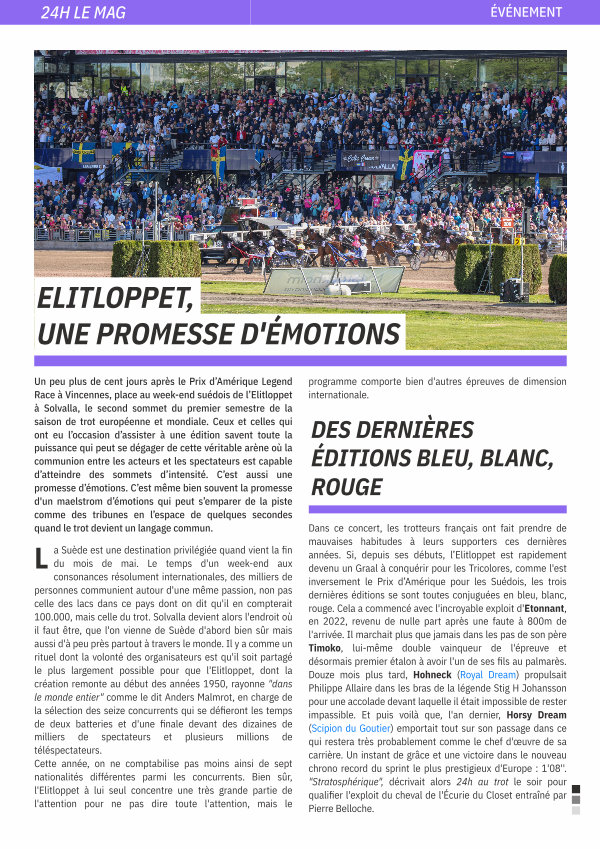 Dans ce concert, les trotteurs français ont fait prendre de mauvaises habitudes à leurs supporters ces dernières années. Si, depuis ses débuts, l’ Elitloppet est rapidement devenu un Graal à conquérir pour les Tricolores, comme l ' est inversement le Prix d’ Amérique pour les Suédois, les trois dernières éditions se sont toutes conjuguées en bleu, blanc, rouge. Cela a commencé avec l ' incroyable exploit d ' Etonnant, en 2022, revenu de nulle part après une faute à 800m de l ' arrivée. Il marchait plus que jamais dans les pas de son père Timoko, lui-même double vainqueur de l ' épreuve et désormais premier étalon à avoir l ' un de ses fils au palmarès. Douze mois plus tard, Hohneck( Royal Dream) propulsait Philippe Allaire dans les bras de la légende Stig H Johansson pour une accolade devant laquelle il était impossible de rester impassible. Et puis voilà que, l ' an dernier, Horsy Dream( Scipion du Goutier) emportait tout sur son passage dans ce qui restera très probablement comme le chef d ' œuvre de sa carrière. Un instant de grâce et une victoire dans le nouveau chrono record du sprint le plus prestigieux d ' Europe: 1 ' 08 ''. " Stratosphérique ", décrivait alors 24h au trot le soir pour qualifier l ' exploit du cheval de l ' Écurie du Closet entraîné par Pierre Belloche.