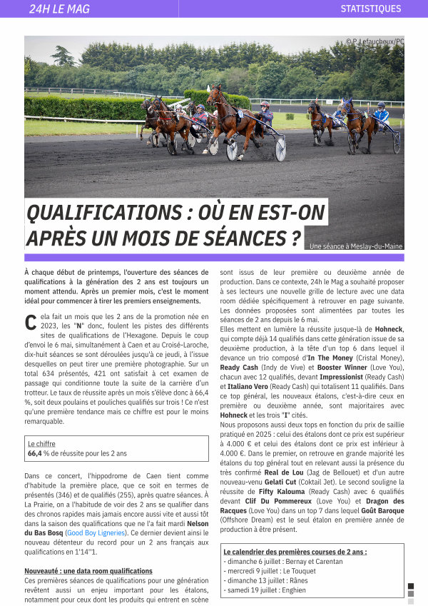 Nouveauté: une data room qualifications Ces premières séances de qualifications pour une génération revêtent aussi un enjeu important pour les étalons, notamment pour ceux dont les produits qui entrent en scène sont issus de leur première ou deuxième année de production. Dans ce contexte, 24h le Mag a souhaité proposer à ses lecteurs une nouvelle grille de lecture avec une data room dédiée spécifiquement à retrouver en page suivante. Les données proposées sont alimentées par toutes les séances de 2 ans depuis le 6 mai. Elles mettent en lumière la réussite jusque-là de Hohneck, qui compte déjà 14 qualifiés dans cette génération issue de sa deuxième production, à la tête d ' un top 6 dans lequel il devance un trio composé d ' In The Money( Cristal Money), Ready Cash( Indy de Vive) et Booster Winner( Love You), chacun avec 12 qualifiés, devant Impressionist( Ready Cash) et Italiano Vero( Ready Cash) qui totalisent 11 qualifiés. Dans ce top général, les nouveaux étalons, c ' est-à-dire ceux en première ou deuxième année, sont majoritaires avec Hohneck et les trois " I " cités. Nous proposons aussi deux tops en fonction du prix de saillie pratiqué en 2025: celui des étalons dont ce prix est supérieur à 4.000 € et celui des étalons dont ce prix est inférieur à 4.000 €. Dans le premier, on retrouve en grande majorité les étalons du top général tout en relevant aussi la présence du très confirmé Real de Lou( Jag de Bellouet) et d ' un autre nouveau-venu Gelati Cut( Coktail Jet). Le second souligne la réussite de Fifty Kalouma( Ready Cash) avec 6 qualifiés devant Clif Du Pommereux( Love You) et Dragon des Racques( Love You) dans un top 7 dans lequel Goût Baroque( Offshore Dream) est le seul étalon en première année de production à être présent.