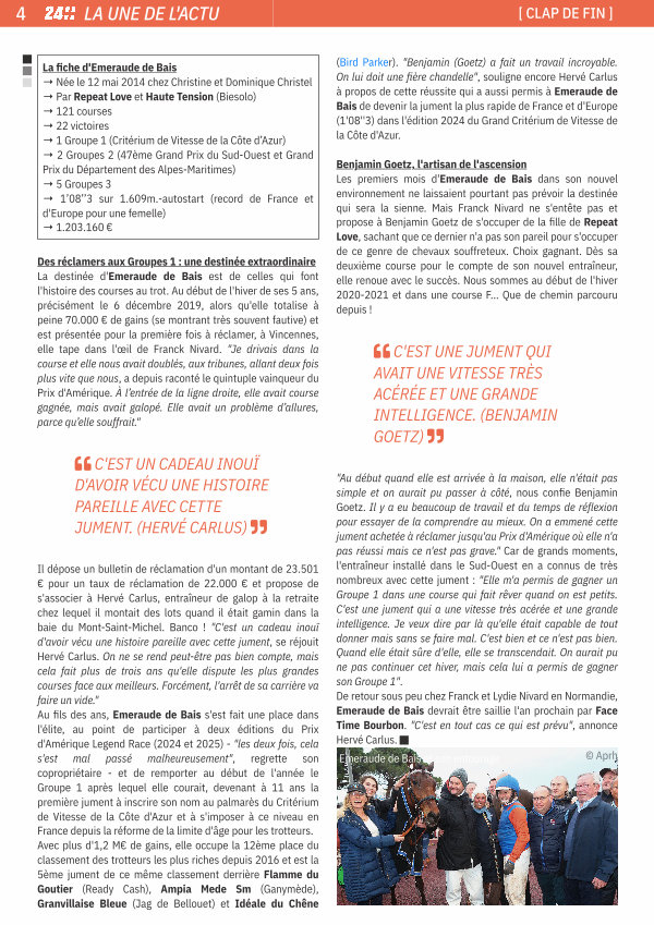 ( Bird Parker). " Benjamin( Goetz) a fait un travail incroyable. On lui doit une fière chandelle ", souligne encore Hervé Carlus à propos de cette réussite qui a aussi permis à Emeraude de Bais de devenir la jument la plus rapide de France et d ' Europe( 1 ' 08 '' 3) dans l ' édition 2024 du Grand Critérium de Vitesse de la Côte d ' Azur.