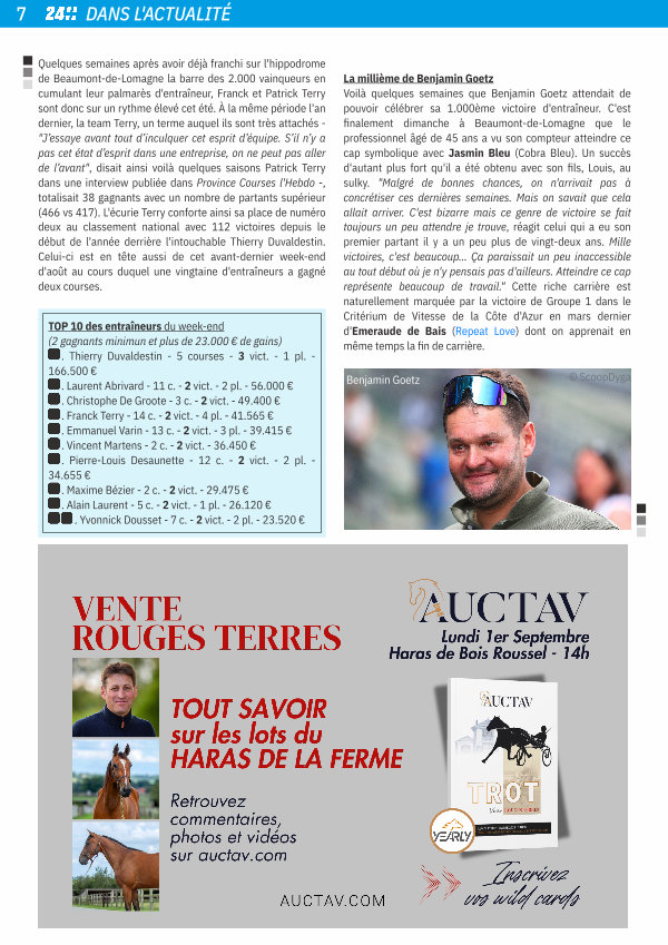 Quelques semaines après avoir déjà franchi sur l ' hippodrome de Beaumont-de-Lomagne la barre des 2.000 vainqueurs en cumulant leur palmarès d ' entraîneur, Franck et Patrick Terry sont donc sur un rythme élevé cet été. À la même période l ' an dernier, la team Terry, un terme auquel ils sont très attachés- " J’ essaye avant tout d’ inculquer cet esprit d’ équipe. S’ il n’ y a pas cet état d’ esprit dans une entreprise, on ne peut pas aller de l’ avant ", disait ainsi voilà quelques saisons Patrick Terry dans une interview publiée dans Province Courses l ' Hebdo-, totalisait 38 gagnants avec un nombre de partants supérieur( 466 vs 417). L ' écurie Terry conforte ainsi sa place de numéro deux au classement national avec 112 victoires depuis le début de l ' année derrière l ' intouchable Thierry Duvaldestin. Celui-ci est en tête aussi de cet avant-dernier week-end d ' août au cours duquel une vingtaine d ' entraîneurs a gagné deux courses.