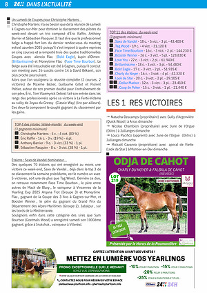 Un samedi de Coupes pour Christophe Martens Christophe Martens n ' a eu besoin que de la réunion de samedi à Cagnes-sur-Mer pour dominer le classement des pilotes du week-end devant un trio composé d ' Éric Raffin, Anthony Barrier et Sébastien Pasquier. Il faut dire que le professionnel belge a frappé fort lors du dernier rendez-vous du meeting estival azuréen 2025 puisqu ' il s ' est imposé à quatre reprises en cinq courses et a remporté trois des quatre traditionnelles Coupes avec Kalencio Flac( Bold Eagle), Lupin d ' Olmen( Brillantissime) et Moneytime Flac( Face Time Bourbon). Le Belge aura été intouchable cet été à Cagnes, puisqu ' il conclut son meeting avec 26 succès contre 14 à David Békaert, son plus proche poursuivant. Alors que l ' on soulignera la réussite complète( 2 courses, 2 victoires) de Maxime Bézier, Guillaume Gillot et Florent Peltier, auteur de son premier doublé pour l ' entraînement de son père, Éric, Tom Vlaemynck Debost fait son entrée dans les rangs des professionnels après sa victoire à La Ferté-Vidame au sulky de Joyau du Gressy( Classic Way)( lire par ailleurs). Ces deux-là composent le couplé gagnant du classement par les gains.