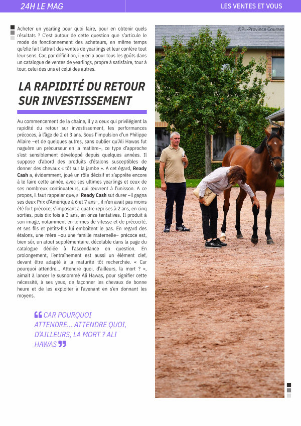 Au commencement de la chaîne, il y a ceux qui privilégient la rapidité du retour sur investissement, les performances précoces, à l’ âge de 2 et 3 ans. Sous l’ impulsion d’ un Philippe Allaire – et de quelques autres, sans oublier qu’ Ali Hawas fut naguère un précurseur en la matière –, ce type d’ approche s’ est sensiblement développé depuis quelques années. Il suppose d’ abord des produits d’ étalons susceptibles de donner des chevaux « tôt sur la jambe ». A cet égard, Ready Cash a, évidemment, joué un rôle décisif et s’ apprête encore à le faire cette année, avec ses ultimes yearlings et ceux de ses nombreux continuateurs, qui œuvrent à l’ unisson. A ce propos, il faut rappeler que, si Ready Cash sut durer – il gagna ses deux Prix d’ Amérique à 6 et 7 ans –, il n’ en avait pas moins été fort précoce, s’ imposant à quatre reprises à 2 ans, en cinq sorties, puis dix fois à 3 ans, en onze tentatives. Il produit à son image, notamment en termes de vitesse et de précocité, et ses fils et petits-fils lui emboîtent le pas. En regard des étalons, une mère – ou une famille maternelle – précoce est, bien sûr, un atout supplémentaire, décelable dans la page du catalogue dédiée à l’ ascendance en question. En prolongement, l’ entraînement est aussi un élément clef, devant être adapté à la maturité tôt recherchée. « Car pourquoi attendre … Attendre quoi, d’ ailleurs, la mort? », aimait à lancer le susnommé Ali Hawas, pour signifier cette nécessité, à ses yeux, de façonner les chevaux de bonne heure et de les exploiter à l’ avenant en s’ en donnant les moyens.