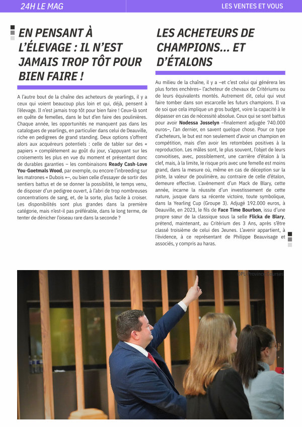 Au milieu de la chaîne, il y a – et c’ est celui qui générera les plus fortes enchères – l’ acheteur de chevaux de Critériums ou de leurs équivalents montés. Autrement dit, celui qui veut faire tomber dans son escarcelle les futurs champions. Il va de soi que cela implique un gros budget, voire la capacité à le dépasser en cas de nécessité absolue. Ceux qui se sont battus pour avoir Nodessa Josselyn – finalement adjugée 740.000 euros –, l’ an dernier, en savent quelque chose. Pour ce type d’ acheteurs, le but est non seulement d’ avoir un champion en compétition, mais d’ en avoir les retombées positives à la reproduction. Les mâles sont, le plus souvent, l’ objet de leurs convoitises, avec, possiblement, une carrière d’ étalon à la clef, mais, à la limite, le risque pris avec une femelle est moins grand, dans la mesure où, même en cas de déception sur la piste, la valeur de poulinière, au contraire de celle d’ étalon, demeure effective. L’ avènement d’ un Mack de Blary, cette année, incarne la réussite d’ un investissement de cette nature, jusque dans sa récente victoire, toute symbolique, dans la Yearling Cup( Groupe 3). Adjugé 192.000 euros, à Deauville, en 2023, le fils de Face Time Bourbon, issu d’ une propre sœur de la classique sous la selle Flicka de Blary, prétend, maintenant, au Critérium des 3 Ans, après s’ être classé troisième de celui des Jeunes. L’ avenir appartient, à l’ évidence, à ce représentant de Philippe Beauvisage et associés, y compris au haras.