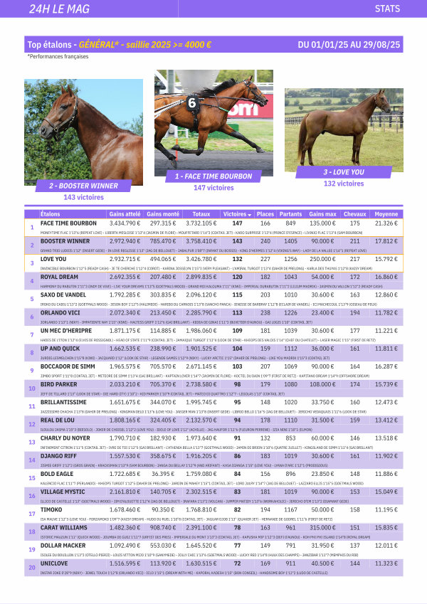 Top étalons- GÉNÉRAL *- saillie 2025 >= 4000 € DU 01 / 01 / 25 AU 29 / 08 / 25
