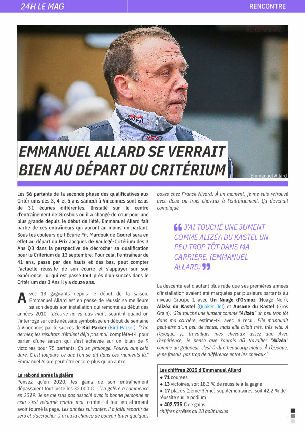 A vec 13 gagnants depuis le début de la saison, Emmanuel Allard est en passe de réussir sa meilleure saison depuis son installation qui remonte au début des années 2010. " L’ écurie ne va pas mal ", sourit-il quand on l ' interroge sur cette réussite symbolisée en début de semaine à Vincennes par le succès de Kid Parker( Bird Parker). " L’ an dernier, les résultats n’ étaient déjà pas mal, complète-t-il pour parler d ' une saison qui s ' est achevée sur un bilan de 9 victoires pour 75 partants. Ça se prolonge. Pourvu que cela dure. C’ est toujours ce que l’ on se dit dans ces moments-là." Emmanuel Allard peut être encore plus qu ' un autre.