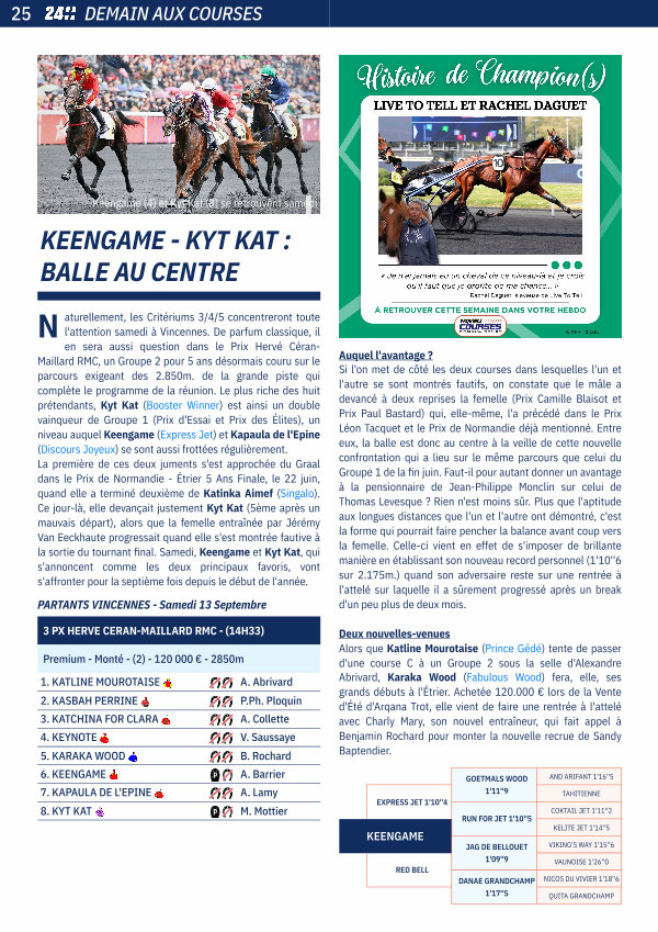 N aturellement, les Critériums 3 / 4 / 5 concentreront toute l ' attention samedi à Vincennes. De parfum classique, il en sera aussi question dans le Prix Hervé Céran- Maillard RMC, un Groupe 2 pour 5 ans désormais couru sur le parcours exigeant des 2.850m. de la grande piste qui complète le programme de la réunion. Le plus riche des huit prétendants, Kyt Kat( Booster Winner) est ainsi un double vainqueur de Groupe 1( Prix d ' Essai et Prix des Élites), un niveau auquel Keengame( Express Jet) et Kapaula de l ' Epine( Discours Joyeux) se sont aussi frottées régulièrement. La première de ces deux juments s ' est approchée du Graal dans le Prix de Normandie- Étrier 5 Ans Finale, le 22 juin, quand elle a terminé deuxième de Katinka Aimef( Singalo). Ce jour-là, elle devançait justement Kyt Kat( 5ème après un mauvais départ), alors que la femelle entraînée par Jérémy Van Eeckhaute progressait quand elle s ' est montrée fautive à la sortie du tournant final. Samedi, Keengame et Kyt Kat, qui s ' annoncent comme les deux principaux favoris, vont s ' affronter pour la septième fois depuis le début de l ' année.