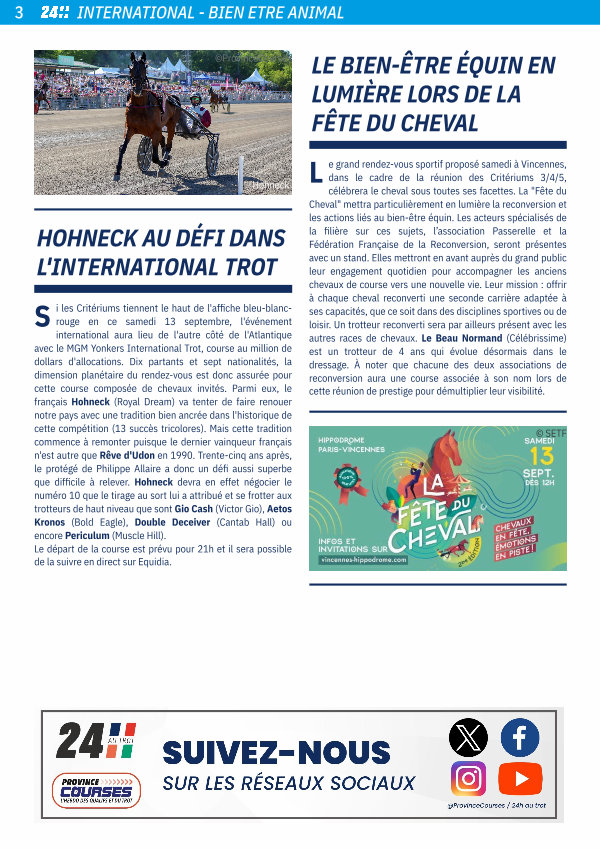 L e grand rendez-vous sportif proposé samedi à Vincennes, dans le cadre de la réunion des Critériums 3 / 4 / 5, célébrera le cheval sous toutes ses facettes. La " Fête du Cheval " mettra particulièrement en lumière la reconversion et les actions liés au bien-être équin. Les acteurs spécialisés de la filière sur ces sujets, l’ association Passerelle et la Fédération Française de la Reconversion, seront présentes avec un stand. Elles mettront en avant auprès du grand public leur engagement quotidien pour accompagner les anciens chevaux de course vers une nouvelle vie. Leur mission: offrir à chaque cheval reconverti une seconde carrière adaptée à ses capacités, que ce soit dans des disciplines sportives ou de loisir. Un trotteur reconverti sera par ailleurs présent avec les autres races de chevaux. Le Beau Normand( Célébrissime) est un trotteur de 4 ans qui évolue désormais dans le dressage. À noter que chacune des deux associations de reconversion aura une course associée à son nom lors de cette réunion de prestige pour démultiplier leur visibilité.