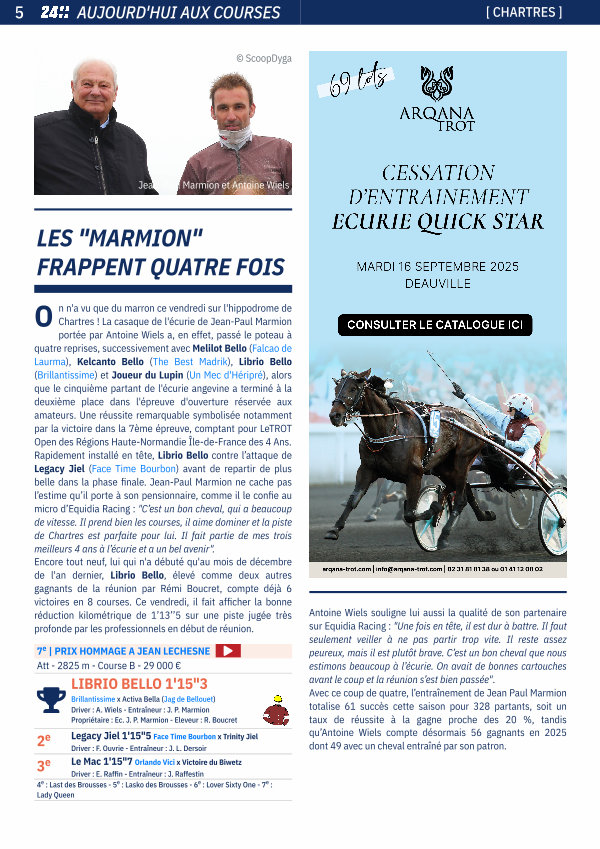 O n n ' a vu que du marron ce vendredi sur l ' hippodrome de Chartres! La casaque de l ' écurie de Jean-Paul Marmion portée par Antoine Wiels a, en effet, passé le poteau à quatre reprises, successivement avec Melilot Bello( Falcao de Laurma), Kelcanto Bello( The Best Madrik), Librio Bello( Brillantissime) et Joueur du Lupin( Un Mec d ' Héripré), alors que le cinquième partant de l ' écurie angevine a terminé à la deuxième place dans l ' épreuve d ' ouverture réservée aux amateurs. Une réussite remarquable symbolisée notamment par la victoire dans la 7ème épreuve, comptant pour LeTROT Open des Régions Haute-Normandie Île-de-France des 4 Ans. Rapidement installé en tête, Librio Bello contre l’ attaque de Legacy Jiel( Face Time Bourbon) avant de repartir de plus belle dans la phase finale. Jean-Paul Marmion ne cache pas l’ estime qu’ il porte à son pensionnaire, comme il le confie au micro d’ Equidia Racing: " C’ est un bon cheval, qui a beaucoup de vitesse. Il prend bien les courses, il aime dominer et la piste de Chartres est parfaite pour lui. Il fait partie de mes trois meilleurs 4 ans à l’ écurie et a un bel avenir ". Encore tout neuf, lui qui n ' a débuté qu ' au mois de décembre de l ' an dernier, Librio Bello, élevé comme deux autres gagnants de la réunion par Rémi Boucret, compte déjà 6 victoires en 8 courses. Ce vendredi, il fait afficher la bonne réduction kilométrique de 1’ 13’’ 5 sur une piste jugée très profonde par les professionnels en début de réunion.