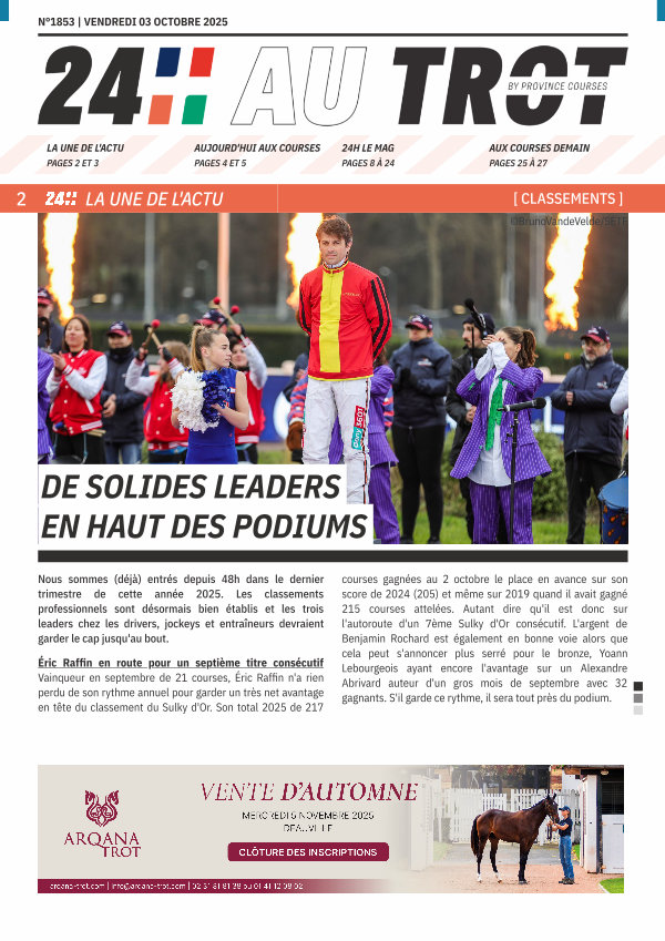 Nous sommes( déjà) entrés depuis 48h dans le dernier trimestre de cette année 2025. Les classements professionnels sont désormais bien établis et les trois leaders chez les drivers, jockeys et entraîneurs devraient garder le cap jusqu ' au bout.