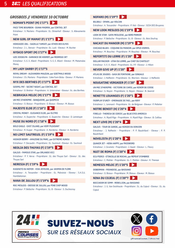 NENETTE LOUANGES( F) 1 ' 20 " 1 � FAIRPLAY D ' URZY- EMERAUDE DE FAEL, par NIKY Entraîneur: L. Lerenard- Propriétaire: Ec. de Belgrave- Eleveur: P. Pelletier NOTRE BENOIT( H) 1 ' 20 " 4 �
