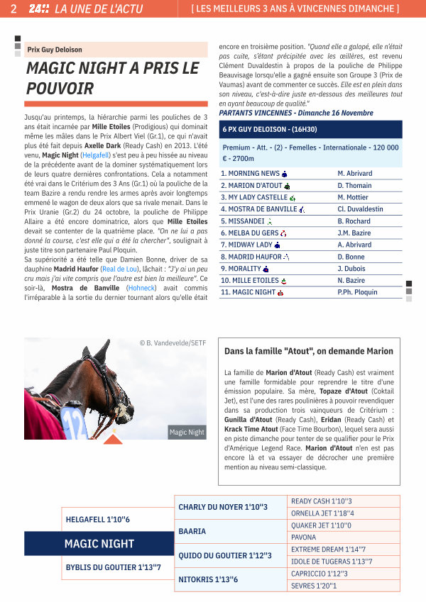 Jusqu ' au printemps, la hiérarchie parmi les pouliches de 3 ans était incarnée par Mille Etoiles( Prodigious) qui dominait même les mâles dans le Prix Albert Viel( Gr. 1), ce qui n ' avait plus été fait depuis Axelle Dark( Ready Cash) en 2013. L ' été venu, Magic Night( Helgafell) s ' est peu à peu hissée au niveau de la précédente avant de la dominer systématiquement lors de leurs quatre dernières confrontations. Cela a notamment été vrai dans le Critérium des 3 Ans( Gr. 1) où la pouliche de la team Bazire a rendu rendre les armes après avoir longtemps emmené le wagon de deux alors que sa rivale menait. Dans le Prix Uranie( Gr. 2) du 24 octobre, la pouliche de Philippe Allaire a été encore dominatrice, alors que Mille Etoiles devait se contenter de la quatrième place. " On ne lui a pas donné la course, c ' est elle qui a été la chercher ", soulignait à juste titre son partenaire Paul Ploquin. Sa supériorité a été telle que Damien Bonne, driver de sa dauphine Madrid Haufor( Real de Lou), lâchait: " J ' y ai un peu cru mais j ' ai vite compris que l ' autre est bien la meilleure ". Ce soir-là, Mostra de Banville( Hohneck) avait commis l ' irréparable à la sortie du dernier tournant alors qu ' elle était encore en troisième position. " Quand elle a galopé, elle n’ était pas cuite, s’ étant précipitée avec les œillères, est revenu Clément Duvaldestin à propos de la pouliche de Philippe Beauvisage lorsqu ' elle a gagné ensuite son Groupe 3( Prix de Vaumas) avant de commenter ce succès. Elle est en plein dans son niveau, c ' est-à-dire juste en-dessous des meilleures tout en ayant beaucoup de qualité." PARTANTS VINCENNES- Dimanche 16 Novembre