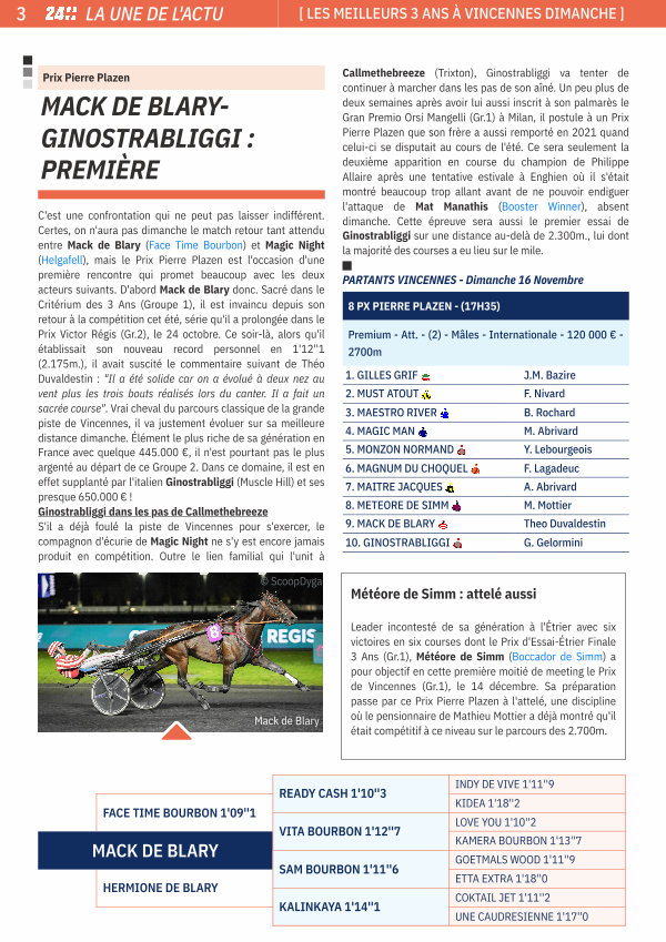C ' est une confrontation qui ne peut pas laisser indifférent. Certes, on n ' aura pas dimanche le match retour tant attendu entre Mack de Blary( Face Time Bourbon) et Magic Night( Helgafell), mais le Prix Pierre Plazen est l ' occasion d ' une première rencontre qui promet beaucoup avec les deux acteurs suivants. D ' abord Mack de Blary donc. Sacré dans le Critérium des 3 Ans( Groupe 1), il est invaincu depuis son retour à la compétition cet été, série qu ' il a prolongée dans le Prix Victor Régis( Gr. 2), le 24 octobre. Ce soir-là, alors qu ' il établissait son nouveau record personnel en 1 ' 12 '' 1( 2.175m.), il avait suscité le commentaire suivant de Théo Duvaldestin: " Il a été solide car on a évolué à deux nez au vent plus les trois bouts réalisés lors du canter. Il a fait un sacrée course ". Vrai cheval du parcours classique de la grande piste de Vincennes, il va justement évoluer sur sa meilleure distance dimanche. Élément le plus riche de sa génération en France avec quelque 445.000 €, il n ' est pourtant pas le plus argenté au départ de ce Groupe 2. Dans ce domaine, il est en effet supplanté par l ' italien Ginostrabliggi( Muscle Hill) et ses presque 650.000 €! Ginostrabliggi dans les pas de Callmethebreeze S ' il a déjà foulé la piste de Vincennes pour s ' exercer, le compagnon d ' écurie de Magic Night ne s ' y est encore jamais produit en compétition. Outre le lien familial qui l ' unit à