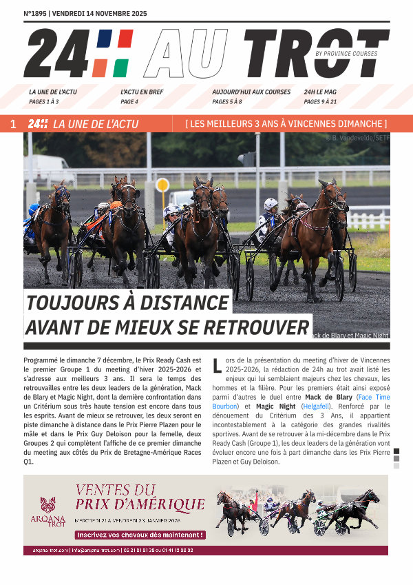 Programmé le dimanche 7 décembre, le Prix Ready Cash est le premier Groupe 1 du meeting d’ hiver 2025-2026 et s’ adresse aux meilleurs 3 ans. Il sera le temps des retrouvailles entre les deux leaders de la génération, Mack de Blary et Magic Night, dont la dernière confrontation dans un Critérium sous très haute tension est encore dans tous les esprits. Avant de mieux se retrouver, les deux seront en piste dimanche à distance dans le Prix Pierre Plazen pour le mâle et dans le Prix Guy Deloison pour la femelle, deux Groupes 2 qui complètent l’ affiche de ce premier dimanche du meeting aux côtés du Prix de Bretagne-Amérique Races Q1.