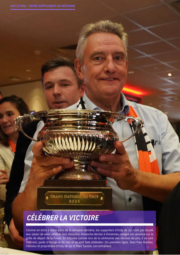 Comme en écho à notre édito de la semaine dernière, les supporters d ' Indy de Jyr n ' ont pas boudé leur plaisir de venir célébrer leur chouchou dimanche dernier à Vincennes, malgré son absence sur la grille de départ de la Finale. En tribunes comme lors de la cérémonie des remises de prix, il se sont faits voir, parés d ' orange et de noir et se sont faits entendre! En première ligne, Jean-Yves Roullier, l ' éleveur et propriétaire d ' Indy de Jyr et Marc Sassier, son entraîneur.
