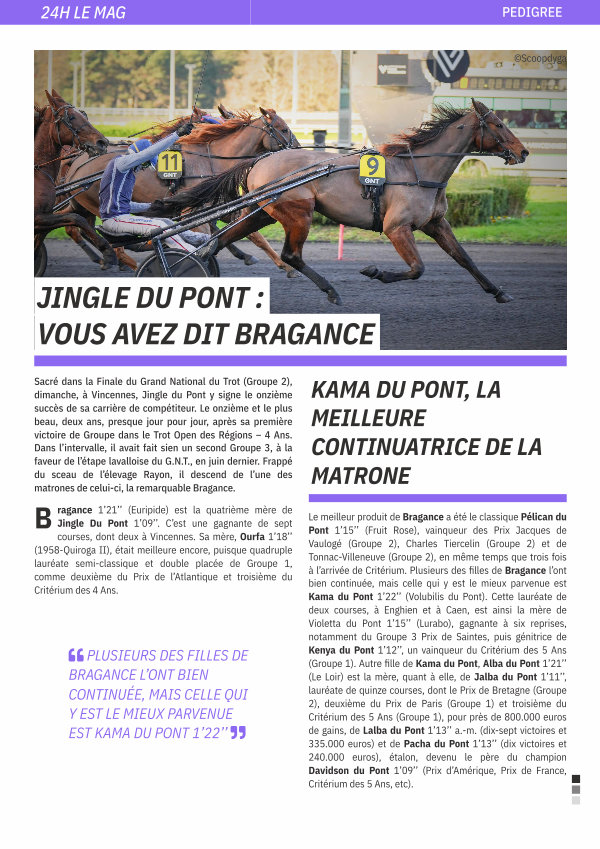 Sacré dans la Finale du Grand National du Trot( Groupe 2), dimanche, à Vincennes, Jingle du Pont y signe le onzième succès de sa carrière de compétiteur. Le onzième et le plus beau, deux ans, presque jour pour jour, après sa première victoire de Groupe dans le Trot Open des Régions – 4 Ans. Dans l’ intervalle, il avait fait sien un second Groupe 3, à la faveur de l’ étape lavalloise du G. N. T., en juin dernier. Frappé du sceau de l’ élevage Rayon, il descend de l’ une des matrones de celui-ci, la remarquable Bragance.