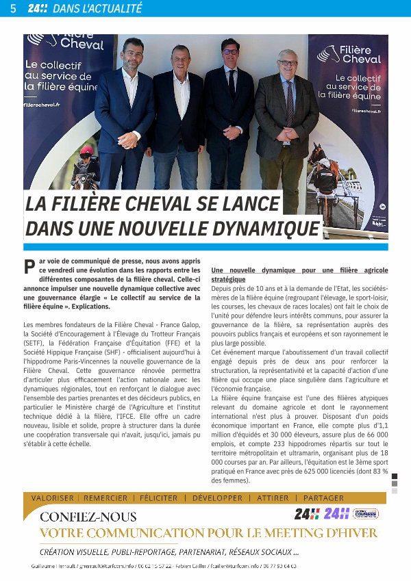 Les membres fondateurs de la Filière Cheval- France Galop, la Société d ' Encouragement à l ' Élevage du Trotteur Français( SETF), la Fédération Française d ' Équitation( FFE) et la Société Hippique Française( SHF)- officialisent aujourd ' hui à l ' hippodrome Paris-Vincennes la nouvelle gouvernance de la Filière Cheval. Cette gouvernance rénovée permettra d ' articuler plus efficacement l ' action nationale avec les dynamiques régionales, tout en renforçant le dialogue avec l ' ensemble des parties prenantes et des décideurs publics, en particulier le Ministère chargé de l ' Agriculture et l ' institut technique dédié à la filière, l ' IFCE. Elle offre un cadre nouveau, lisible et solide, propre à structurer dans la durée une coopération transversale qui n ' avait, jusqu ' ici, jamais pu s ' établir à cette échelle.