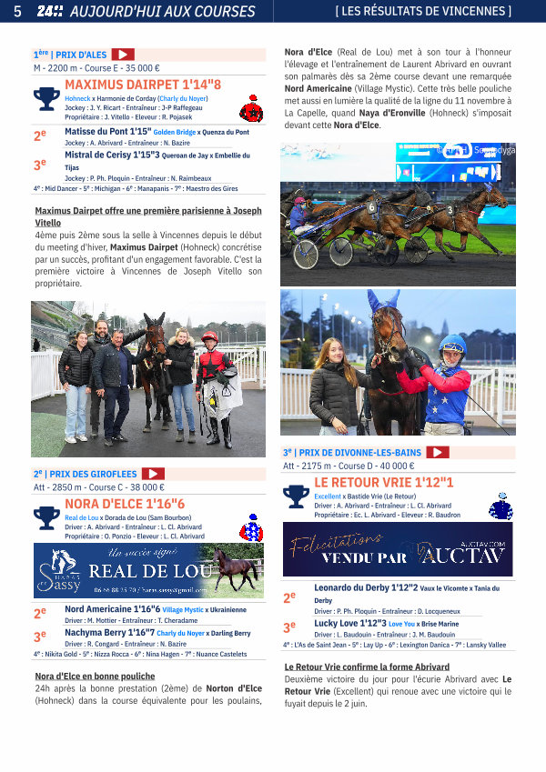 Nora d ' Elce( Real de Lou) met à son tour à l ' honneur l ' élevage et l ' entraînement de Laurent Abrivard en ouvrant son palmarès dès sa 2ème course devant une remarquée Nord Americaine( Village Mystic). Cette très belle pouliche met aussi en lumière la qualité de la ligne du 11 novembre à La Capelle, quand Naya d ' Eronville( Hohneck) s ' imposait devant cette Nora d ' Elce.