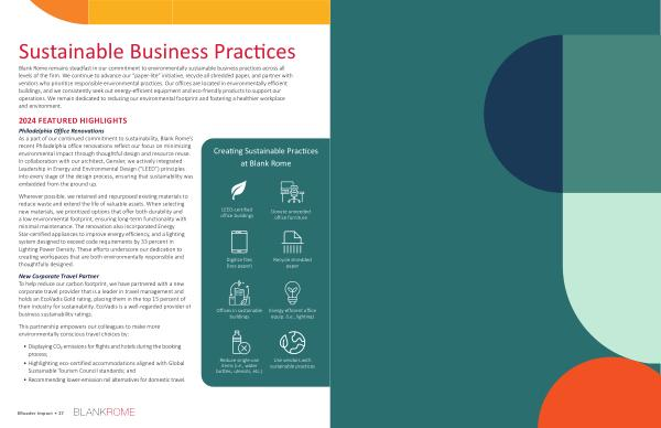 Blank Rome remains steadfast in our commitment to environmentally sustainable business practices across all levels of the firm. We continue to advance our“ paper-lite” initiative, recycle all shredded paper, and partner with vendors who prioritize responsible environmental practices. Our offices are located in environmentally efficient buildings, and we consistently seek out energy-efficient equipment and eco-friendly products to support our operations. We remain dedicated to reducing our environmental footprint and fostering a healthier workplace and environment.