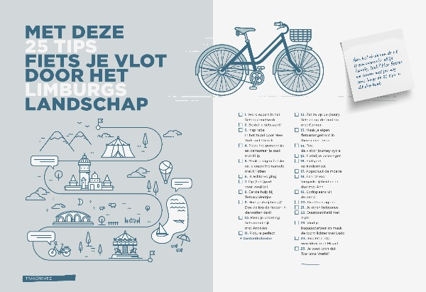 12. Zet ze op de( huur) fiets en op de tandem met Carmen 13. Maak je eigen fietsarrangement in thema met Tessa 14. Test de visitor journey cycle 15. Fietsrijke belevingen 16. Fietspret op kindermaat 17. Appsoluut de moeite 18. Een 10 voor toegankelijkheid en in duo met Ann 19. Spring eens uit de band 20. Quattro stagioni 21. Je eigen fietstenue 22. Duurzaamheid met 4 p’ s! 23. Vind je bagagepartner en maak de tocht lichter met Ludo 24. Inspiratie: Op wereldreis met Mikael 25. Je weet toch dat Toerisme Werkt?