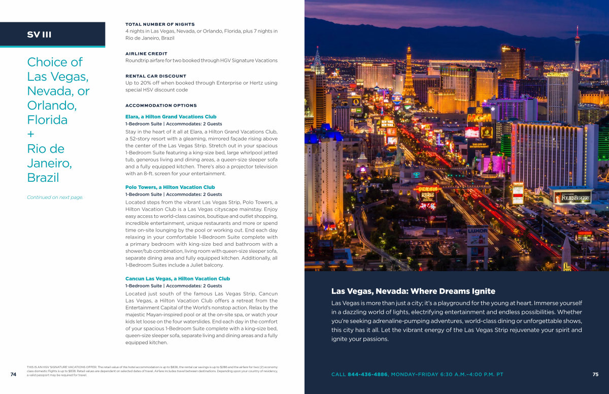 THIS IS AN HGV SIGNATURE VACATIONS OFFER. The retail value of the hotel accommodation is up to $ 836, the rental car savings is up to $ 286 and the airfare for two( 2) economy class domestic flights is up to $ 838. Retail values are dependent on selected dates of travel. Airfare includes travel between destinations. Depending upon your country of residency, a valid passport may be required for travel.