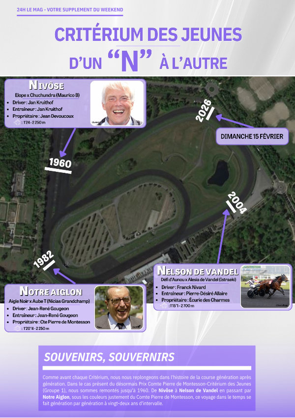 Comme avant chaque Critérium, nous nous replongeons dans l ' histoire de la course génération après génération. Dans le cas présent du désormais Prix Comte Pierre de Montesson-Critérium des Jeunes( Groupe 1), nous sommes remontés jusqu ' à 1960. De Nivôse à Nelson de Vandel en passant par Notre Aiglon, sous les couleurs justement du Comte Pierre de Montesson, ce voyage dans le temps se fait génération par génération à vingt-deux ans d ' intervalle.