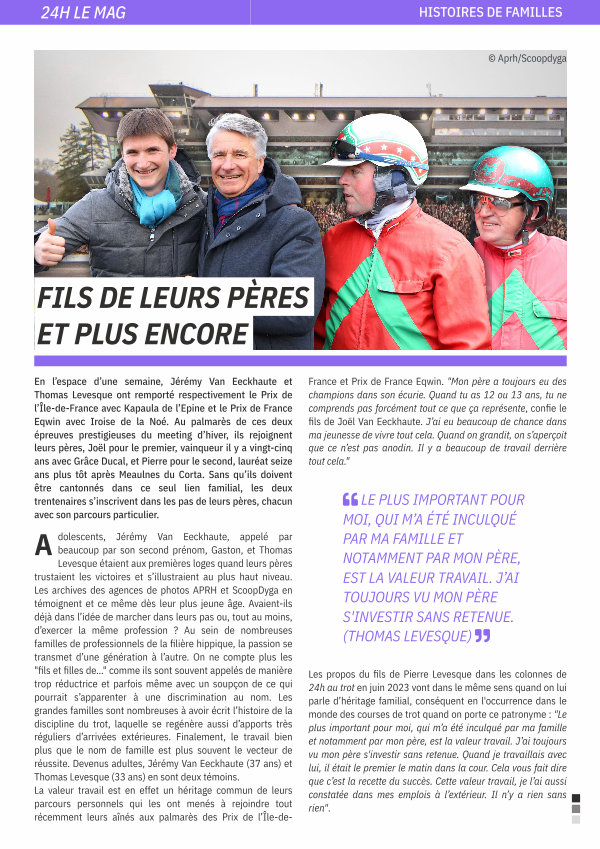 A dolescents, Jérémy Van Eeckhaute, appelé par beaucoup par son second prénom, Gaston, et Thomas Levesque étaient aux premières loges quand leurs pères trustaient les victoires et s’ illustraient au plus haut niveau. Les archives des agences de photos APRH et ScoopDyga en témoignent et ce même dès leur plus jeune âge. Avaient-ils déjà dans l’ idée de marcher dans leurs pas ou, tout au moins, d’ exercer la même profession? Au sein de nombreuses familles de professionnels de la filière hippique, la passion se transmet d’ une génération à l’ autre. On ne compte plus les " fils et filles de …" comme ils sont souvent appelés de manière trop réductrice et parfois même avec un soupçon de ce qui pourrait s’ apparenter à une discrimination au nom. Les grandes familles sont nombreuses à avoir écrit l’ histoire de la discipline du trot, laquelle se regénère aussi d’ apports très réguliers d’ arrivées extérieures. Finalement, le travail bien plus que le nom de famille est plus souvent le vecteur de réussite. Devenus adultes, Jérémy Van Eeckhaute( 37 ans) et Thomas Levesque( 33 ans) en sont deux témoins. La valeur travail est en effet un héritage commun de leurs parcours personnels qui les ont menés à rejoindre tout récemment leurs aînés aux palmarès des Prix de l’ Île-de-