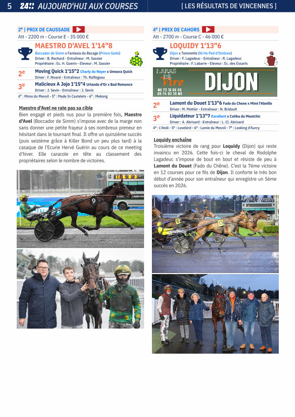 Loquidy enchaîne Troisième victoire de rang pour Loquidy( Dijon) qui reste invaincu en 2026. Cette fois-ci le cheval de Rodolphe Lagadeuc s’ impose de bout en bout et résiste de peu à Lamont du Douet( Fado du Chêne). C’ est la 7ème victoire en 12 courses pour ce fils de Dijon. Il conforte le très bon début d’ année pour son entraîneur qui enregistre un 5ème succès en 2026.