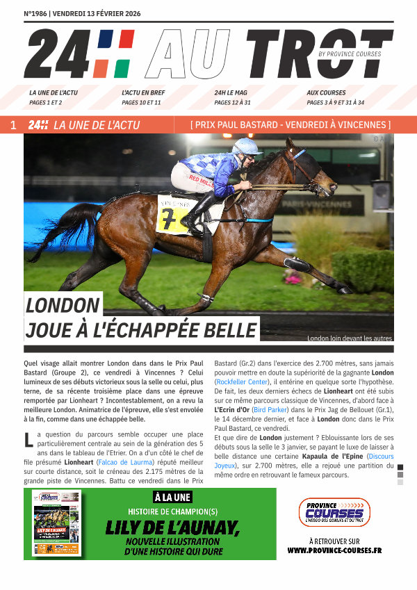 Bastard( Gr. 2) dans l ' exercice des 2.700 mètres, sans jamais pouvoir mettre en doute la supériorité de la gagnante London( Rockfeller Center), il entérine en quelque sorte l ' hypothèse. De fait, les deux derniers échecs de Lionheart ont été subis sur ce même parcours classique de Vincennes, d ' abord face à L ' Ecrin d ' Or( Bird Parker) dans le Prix Jag de Bellouet( Gr. 1), le 14 décembre dernier, et face à London donc dans le Prix Paul Bastard, ce vendredi. Et que dire de London justement? Eblouissante lors de ses débuts sous la selle le 3 janvier, se payant le luxe de laisser à belle distance une certaine Kapaula de l ' Epine( Discours Joyeux), sur 2.700 mètres, elle a rejoué une partition du même ordre en retrouvant le fameux parcours.