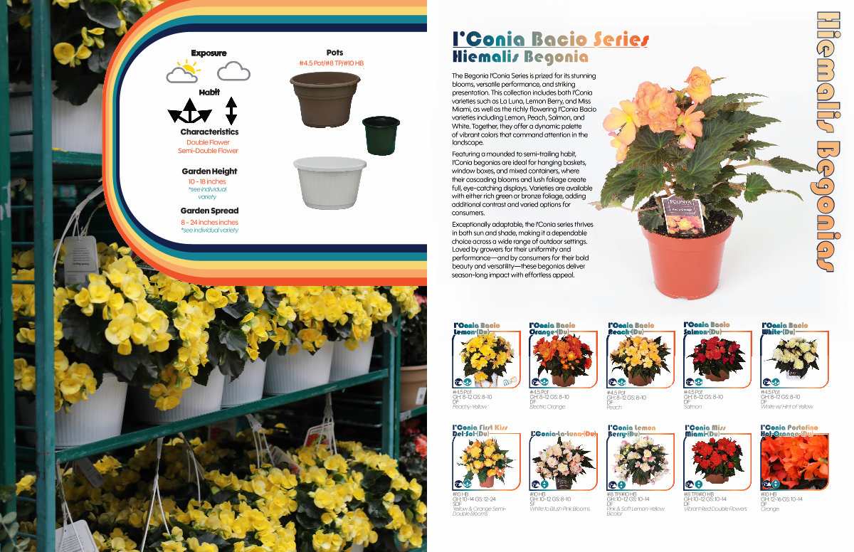 Exceptionally adaptable, the I’ Conia series thrives in both sun and shade, making it a dependable choice across a wide range of outdoor settings. Loved by growers for their uniformity and performance— and by consumers for their bold beauty and versatility— these begonias deliver season-long impact with effortless appeal.