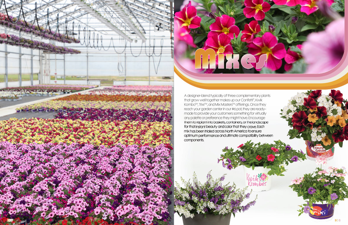 A designer-blend typically of three complementary plants that grow well together makes up our Confetti ®, Kwik Kombo TM, Trixi TM, and Mix Masters TM offerings. Once they reach your garden center in our # 6 pot, they are readymade to provide your customers something for virtually any palette or preference they might have. Encourage them to replant into baskets, containers, or the landscape for that instant beauty and color that they crave. Each mix has been trialed across North America to ensure optimum performance and ultimate compatibility between components.