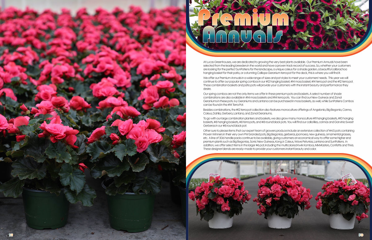 At Lucas Greenhouses, we are dedicated to growing the very best plants available. Our Premium Annuals have been selected from the leading breeders in the world and have a proven track record of success. So, whether your customers are looking for the perfect SunPatiens for the landscape, a unique coleus for a shade garden, a beautiful calibrachoa hanging basket for their patio, or a stunning Calliope Geranium terra pot for the deck, this is where you will find it.