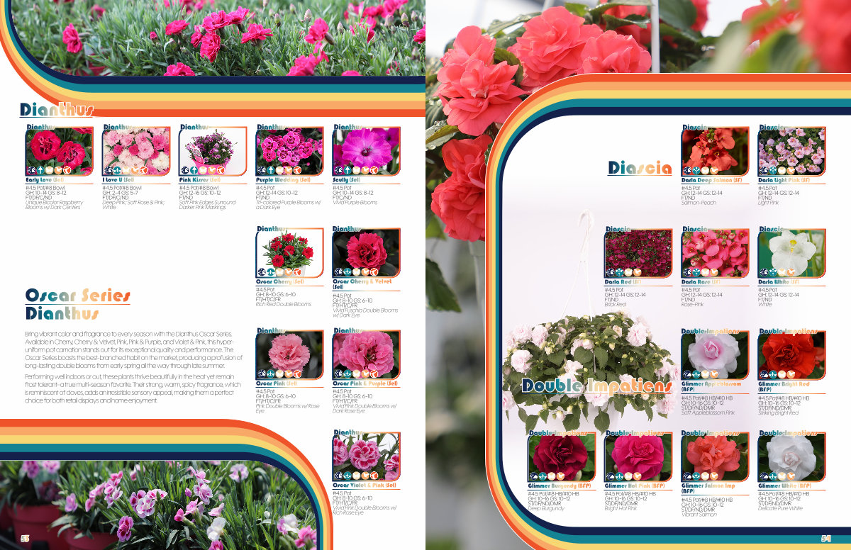 Bring vibrant color and fragrance to every season with the Dianthus Oscar Series. Available in Cherry, Cherry & Velvet, Pink, Pink & Purple, and Violet & Pink, this hyperuniform pot carnation stands out for its exceptional quality and performance. The Oscar Series boasts the best-branched habit on the market, producing a profusion of long-lasting double blooms from early spring all the way through late summer.